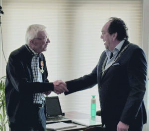 Tijdens de vergadering van 20 maart jl. kreeg Frans Maes, de spreker op de DDD-avond van 30 september, uit handen van locoburgemeester Jan de Geus een koninklijke onderscheiding. Een lintje voor al zijn werk voor de verspreiding van kennis over – en waardering voor – zonnewijzers, zowel binnen als buiten de vereniging (zie foto).