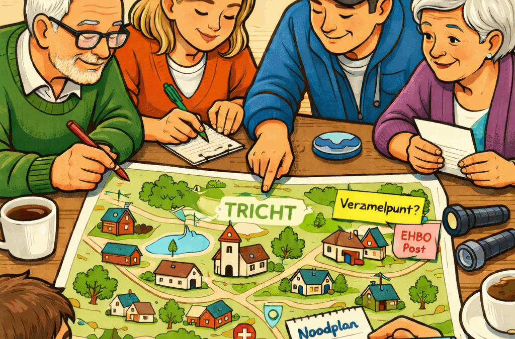 In ons dorp is daarom een groep dorpsgenoten bijeengekomen om na te denken over wat wij met en voor elkaar kunnen doen. Om te bouwen aan een netwerk, zodat in geval van nood niemand alleen blijft staan. Er zijn rondom ons organisaties die kunnen helpen, maar we zoeken ook naar mensen zoals jij en ik, die elkaar kunnen bijstaan als het misloopt. Nu meedenken en in geval van nood meedoen. Wat kun je betekenen voor een ander? Een boodschap, een helpende hand bij een lekkend dak of een kapot raam, kinderopvang, of zo nodig iemand van het dak afhalen of misschien wel onder het puin vandaan. En waar liggen jouw zorgen en vragen in je eigen situatie, als je hulpbehoevend bent en een helpende hand zou kunnen gebruiken?